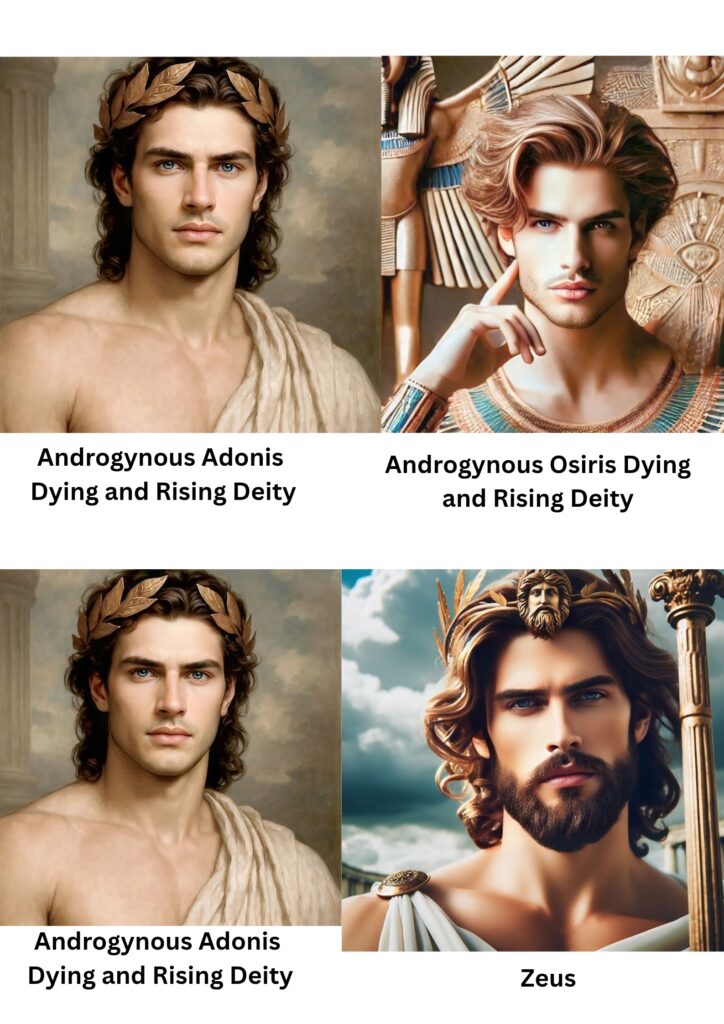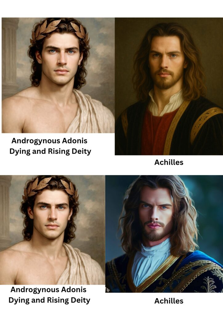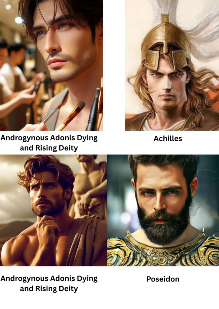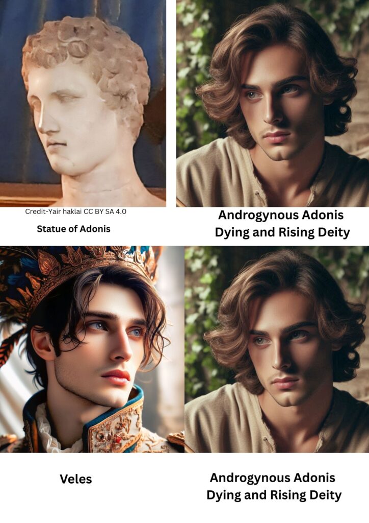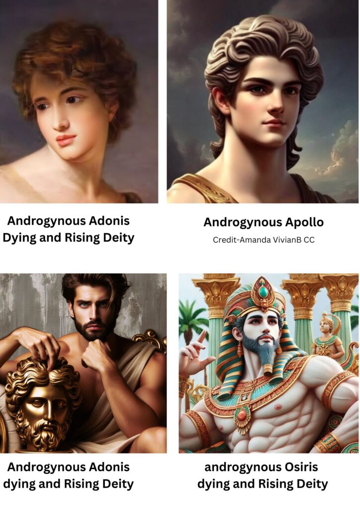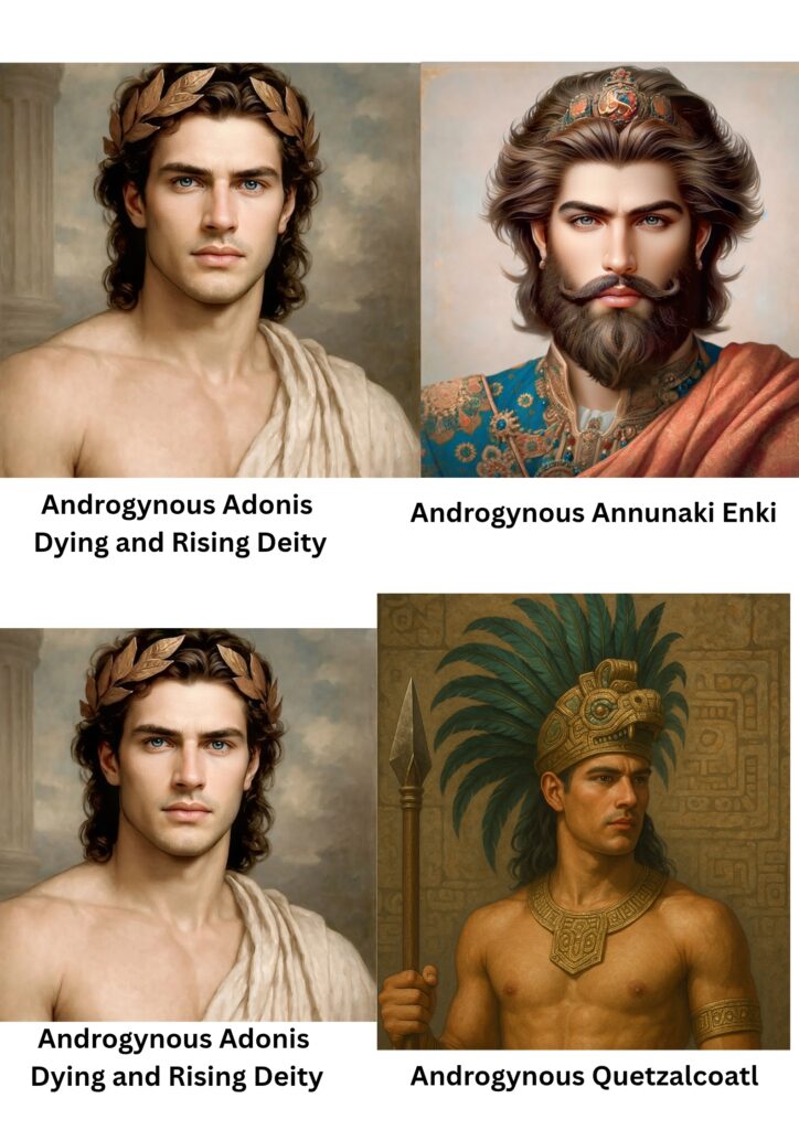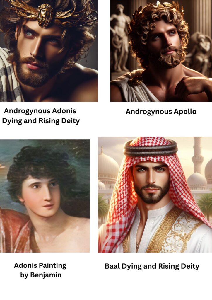 Adonis is a Greek Dying and Rising Deity, Mortal consort of Androgynous Aphrodite, Known as a Baal in Arabic civilization,and as a Tammuz in Mesopotamia, there are several myths found regarding this Androgynous Deity as a tragic love story of Adonis and his consort Aphrodite.