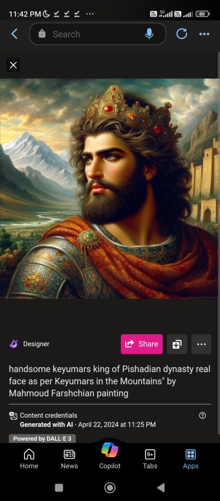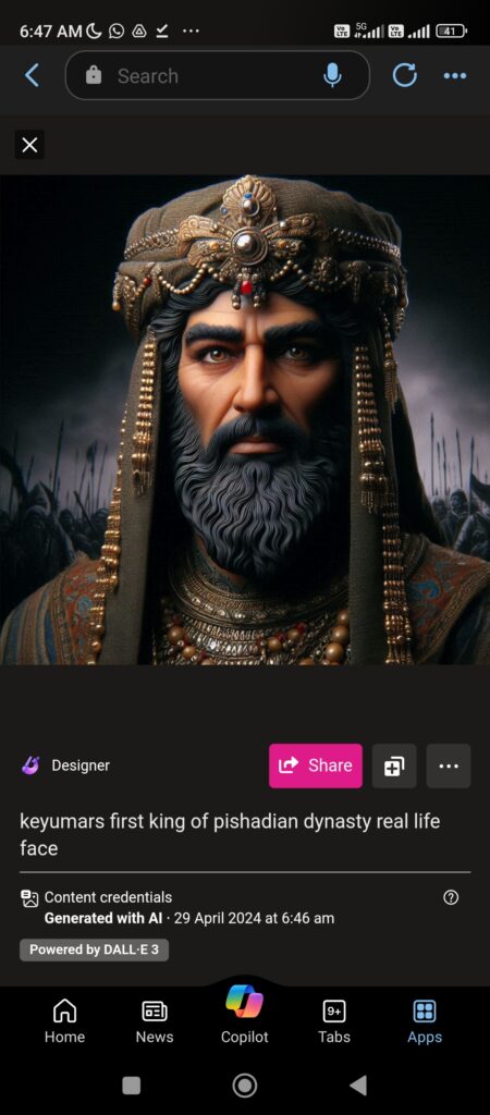 During his reign, humans lived among wild animals, gradually learning to domesticate them. Keyumars introduced the earliest forms of law, justice, and royal customs. He was so revered that even beasts paid homage to him. Ahura Mazda granted him the divine radiance known as farr, a supernatural light reserved for rightful kings.Keyumars’ legacy is profound. He is remembered not just as a mythical ancestor, but as a symbol of justice, divine favor, and the beginning of human civilization. His name itself — derived from Avestan roots meaning “mortal life” — reflects his role as the bridge between divine creation and earthly existence.